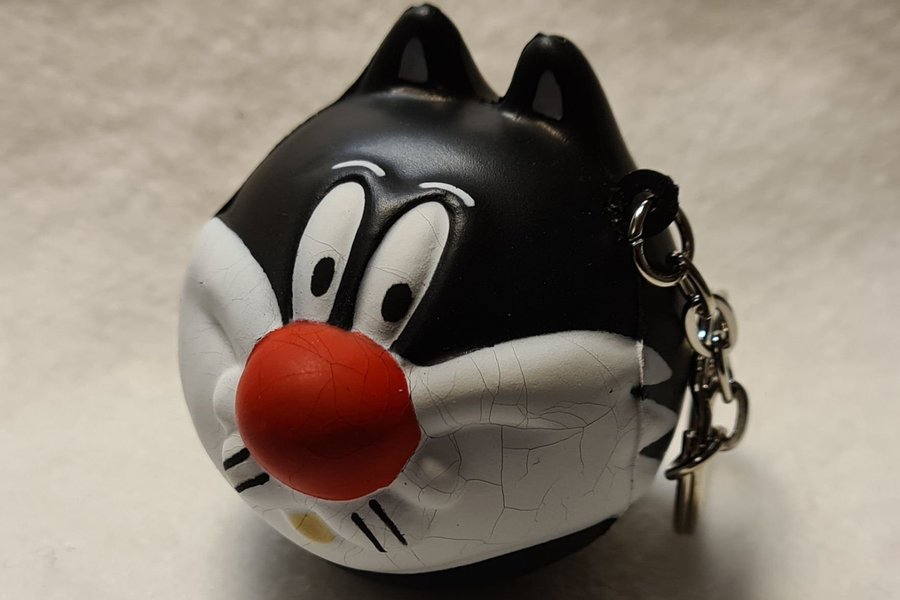 Nyckelring föreställande Sylvester Katten från Looney Tunes. Nyckelringen är svart och vit med en röd nos. Samfraktar