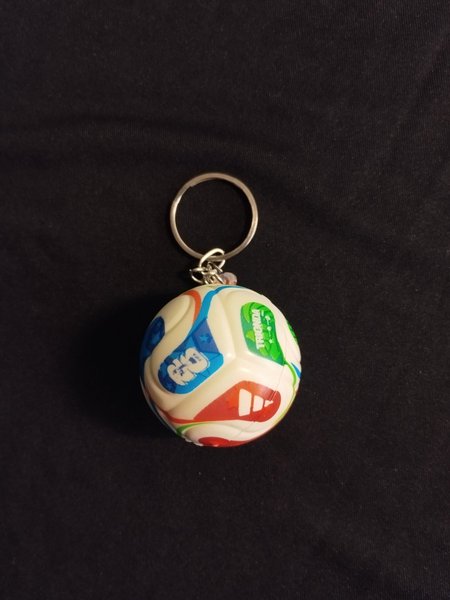 Nyckelring formad som en fotboll. Färgerna är vit, blå, röd och grön. Den har texten "TRIONDA" och "FIFA" samt Adidas-logotypen.