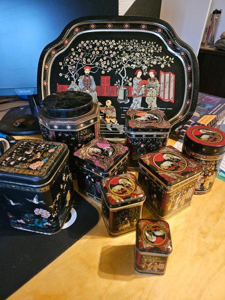 Har 7 st burkar i samma stil och en udda. Plus bricka. Använt skick men fullt användbara.