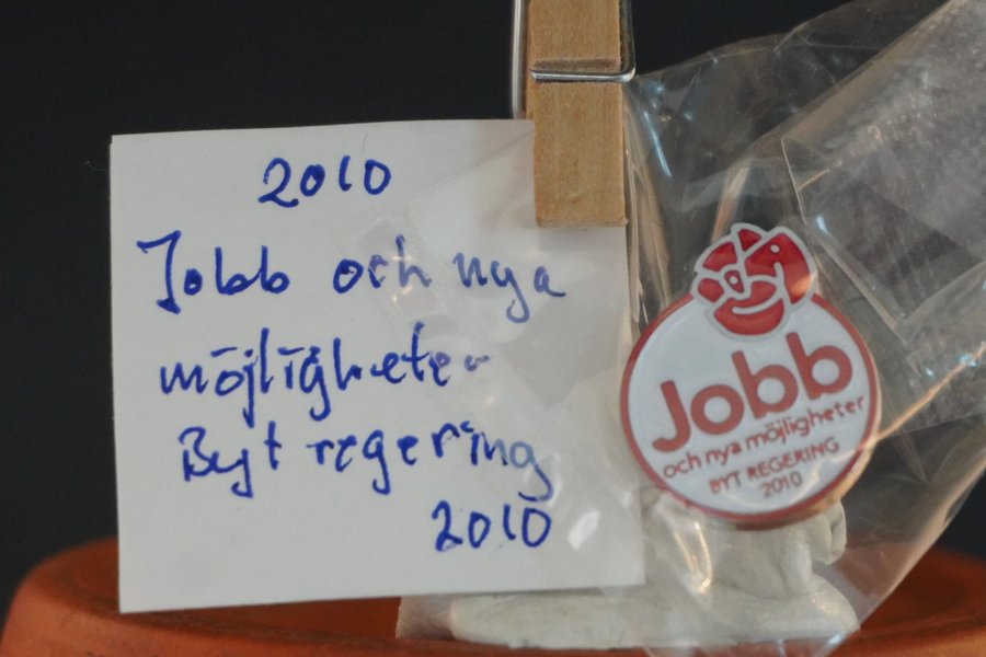 1 maj nål, årtal enligt bild 2010 Jobb och nya möjligheter Byt regering 2010