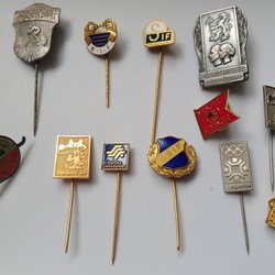 Samling av pins och märken, inklusive "VM Ishockey 63 Stockholm 7-17 Mars", "Svenska Tyngdlyftningsförbundets Diplomärke", "För Sverige", "Stora Riksmarsch", "Canada", "Speedway", "UKrS" och "AGIF".