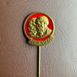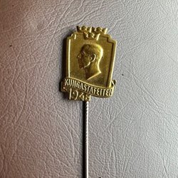 En nål med texten "Riksmarsch" och två skor.
