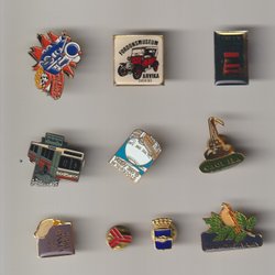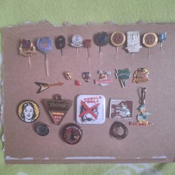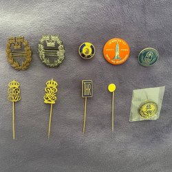 Samling av pins och märken. Inkluderar märken från Lublin, A383 1940-1965, Bandoska W Rz Rzeszow, RET, Brno 68, Rostovsky Technikum 1928 och Inzhbulinek.