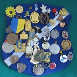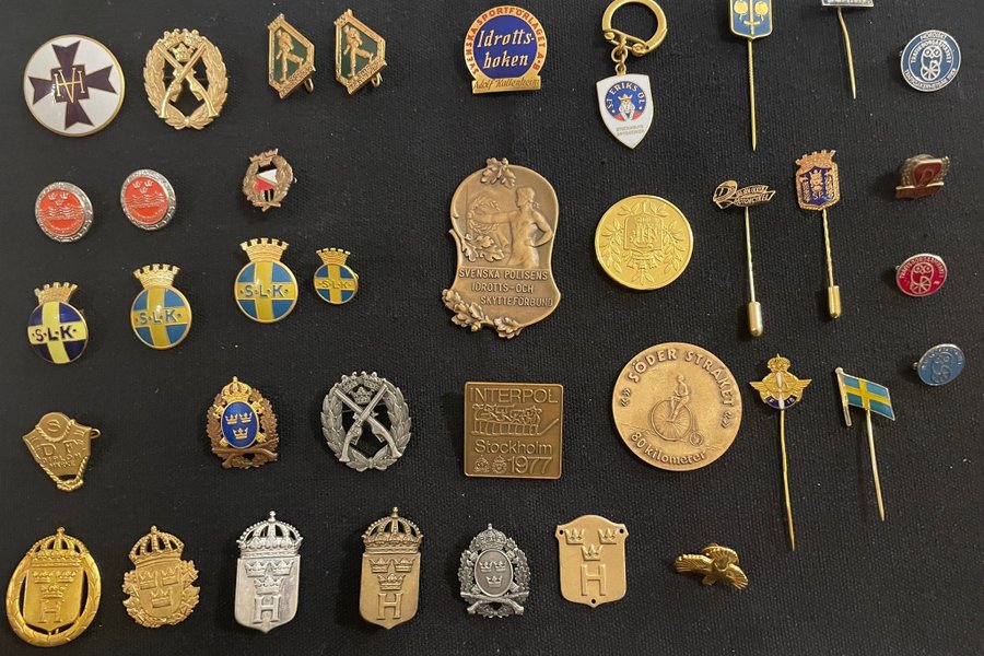 En samling av diverse märken, inklusive märken från Svenska Polisens Idrotts- och Skytteförbund, Interpol Stockholm från 1977, S:t Eriks Öl, Scania, och märken relaterade till trafiksäkerhet. Inkluderar även märken med kronor och bokstaven H, samt SLK märken och "Söderstraken 80 kilometer".