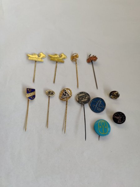 Parti med pins, diverse motiv. Inkluderar "Riksmarsch", SGF, cykel, och andra märken.