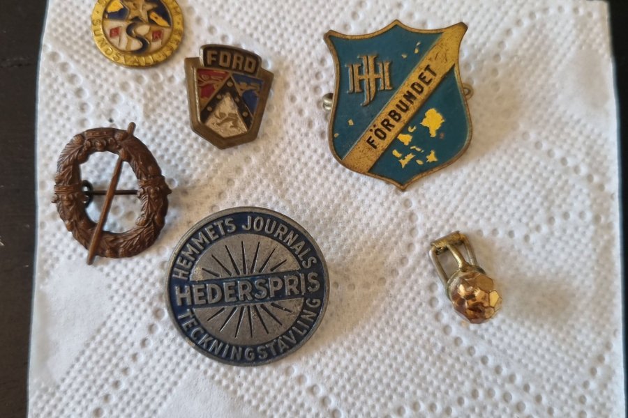 Ett sortiment av diverse märken, inklusive märken från Ford, Hemmets Journal och IHL Förbundet.
