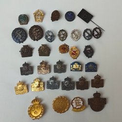 En samling av olika märken. Inkluderar märken med kungliga motiv, jaktmotiv och andra diverse motiv. Ett märke har årtalet 1940.