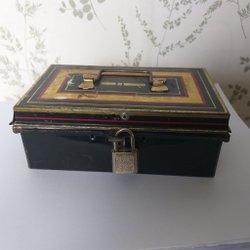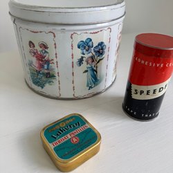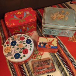 Olika plåtburkar, inklusive Mazetti Ögon cacao och Fazer mocca liqueur filled chocolates.