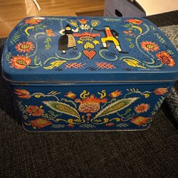 Röd plåtburk med motiv av G åkerlind.