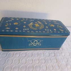 1 objekt. Charmig plåtburk. Cirkamått: Höjd 9 cm. Bredd o djup 22*22 cm. I använt skick, med patina, se bilder. Burken har stått i solljus och troligen även dammats lite för ofta, så dekoren är blekt där. Inget som tar bort charmen enligt mig.