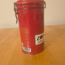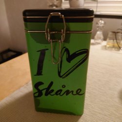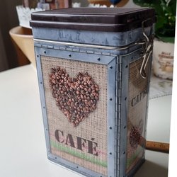 Kaffeburk i plåt med ett handtag på locket. Burken är blågrön och har texten ”Kaffe” tryckt i rött på framsidan. Höjd 16 cm exkl. handtag. Bra skick!
