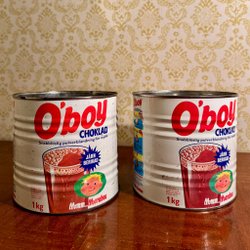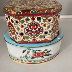 Två dekorativa plåtburkar med asiatiskt motiv.