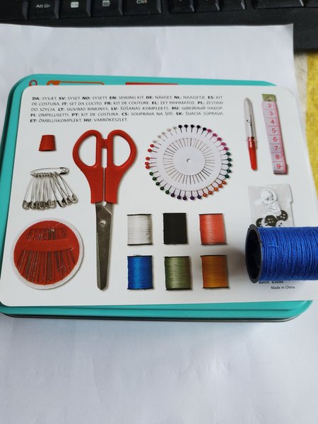Sykit med sax, måttband, nålar, säkerhetsnålar, trådrullar i olika färger och knappar. Förpackat i en praktisk plåtask.