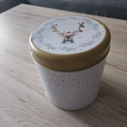 Plåtburk som det varit godis i. Höjd 16.5, bredd 13 cm.