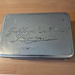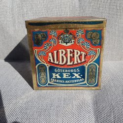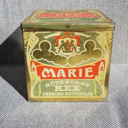 Riktigt gammal burk från Göteborgs Kexfabrik med bilder från bla fabriken i Kungälv.
