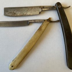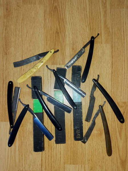 Parti med rakknivar. Inkluderar knivar med handtag i olika färger och material.