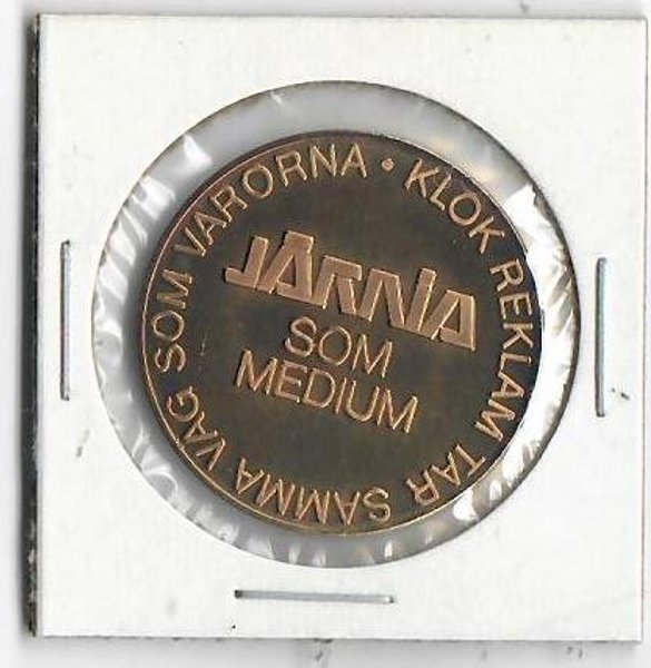 Reklammynt från Järnia. Texten lyder: Järnia som medium, klok reklam tar samma väg som varorna, pollet.