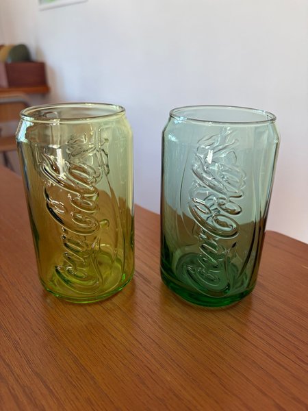 Två Coca-Cola glas i, 1 grönt och 1 gul/grönt Glasen är formade som burkar.