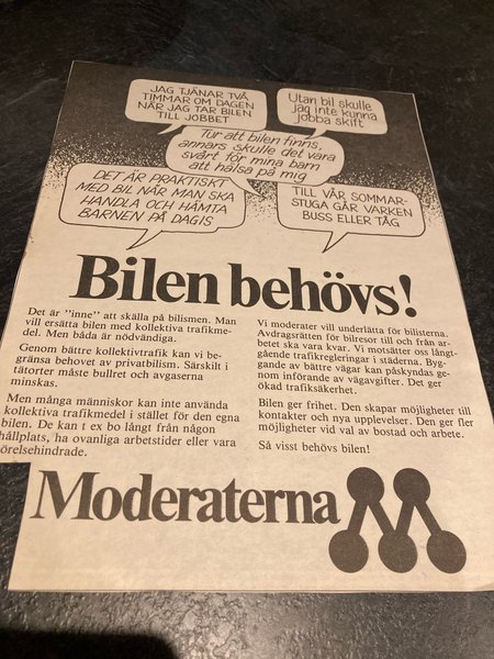 Äkta reklamannons från förr där Moderaterna anser att bilen behövs.