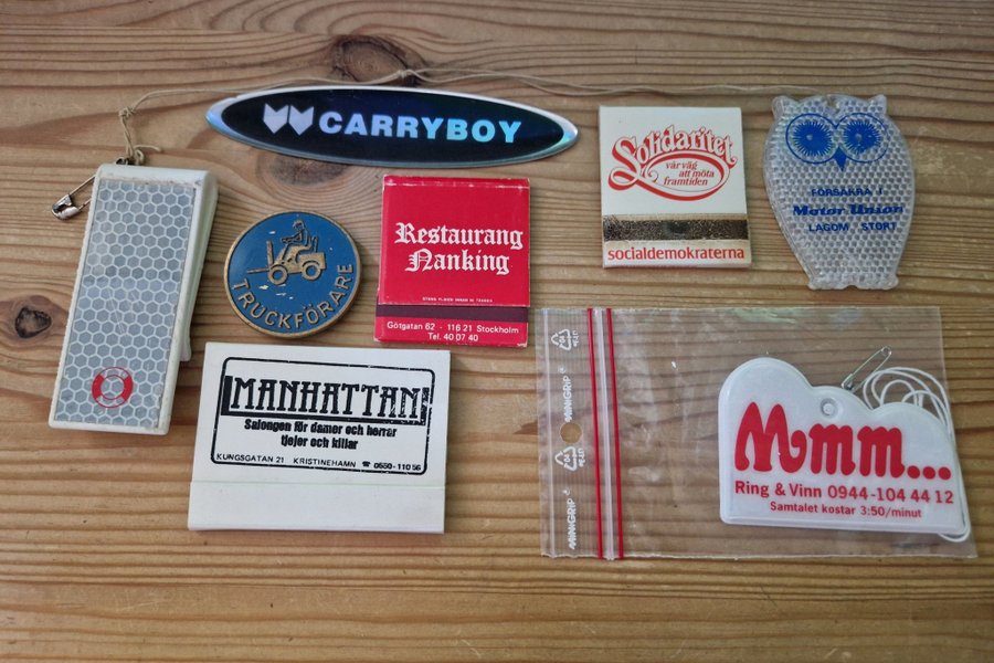 Tändsticksplån, Truckförare skylt, reflexer, och en skylt från Cabbys carryboy.