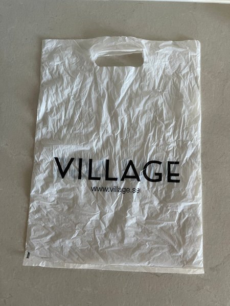 Vit plastpåse 27,5x37cm med texten "VILLAGE" och "www.village.se" tryckt i svart på framsidan. Påsen har ett utskuret handtag.