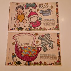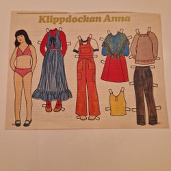 Klassisk klippdocka från tidningen Året Runt. Inkluderar en docka och flera olika klädesplagg och accessoarer att klippa ut och leka med.