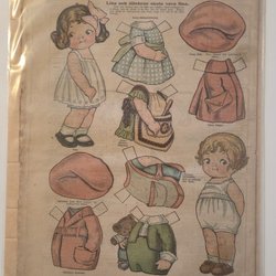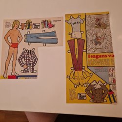 Klippdockor Pelle svanslös på maskerad och två med Mulle Meck. 30x21 cm kraftig papp. Baksidan utformade som vykort.