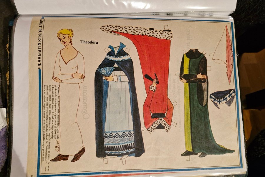 Theodora bär kläder från medeltiden. Den röda pälskantade klänningen var högsta mode på 1300-talet i Frankrike bland annat. Likaså den höga spetsiga hatten, "hennin". Den gröna klänningen är ungefär hundra år äldre. De stora ärmhålen i den vida överklänningen kallades ibland för "helvetesfönster" - man kunde se kvinnokroppens former i den snäva underklänningen genom dem.