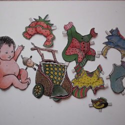 Diverse klippdockor i varierat skick: Bamse, Monchichi, Disney och några smådockor 7 cm. En del kläder och tillbehör. 70-80-tal.