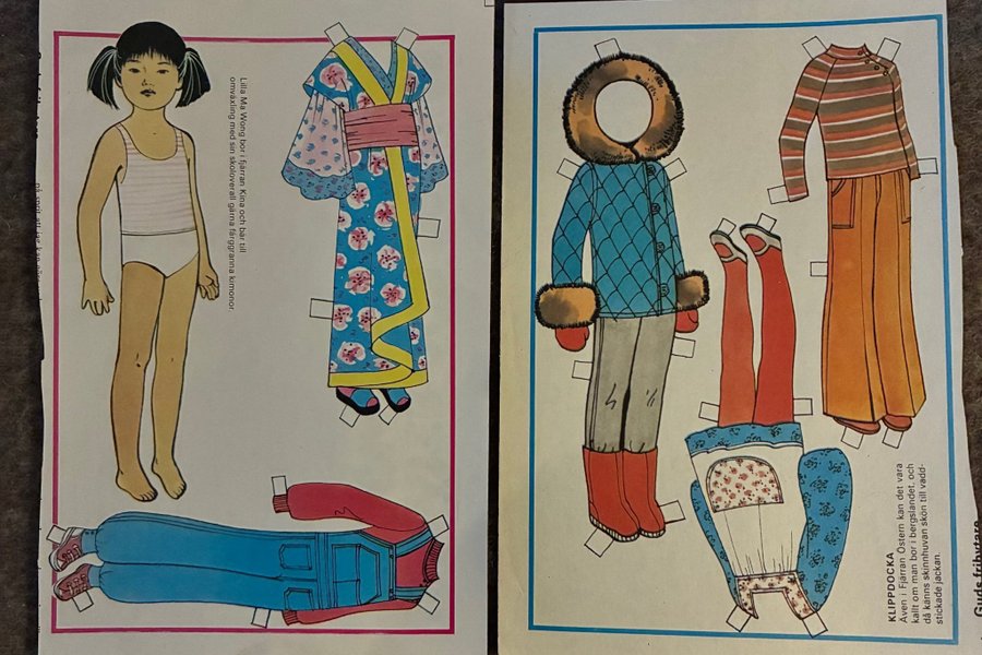 Klassiska klippdockor med tillhörande kläder. Inkluderar en docka som heter Lilla Ma Wong med flera olika outfits som kimono och vinterkläder.