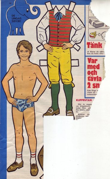 Denna klippdocka har lite bucklor samt en reva. Klädesplagget är inte komplett. Det fattas en del av skorna tyvårr.