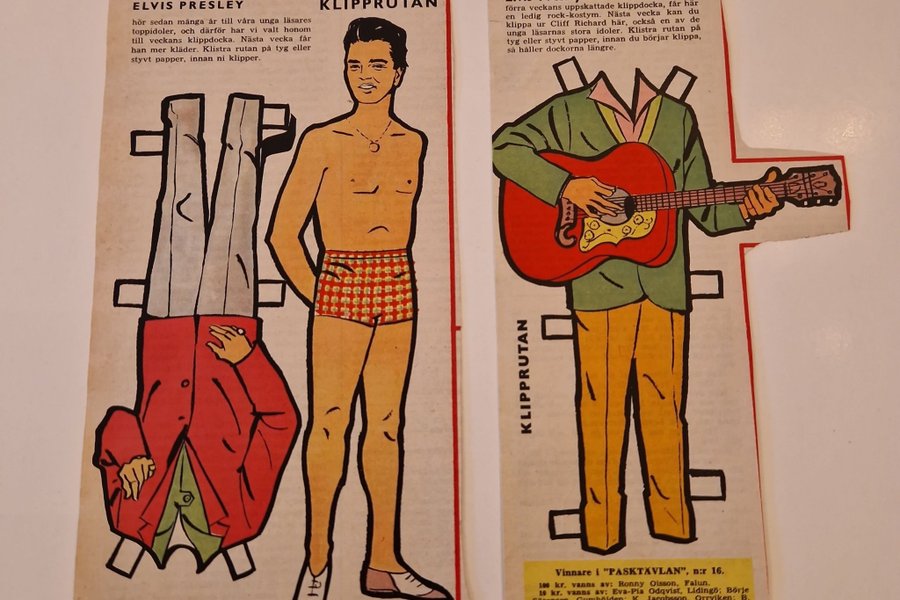 Klippdocka av Elvis Presley från Klipprutan. Inkluderar en ledig rock-kostym. Klistra rutan på tyg eller styvt papper innan du klipper.