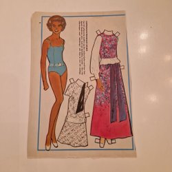 Klippdocka Agneta Munther med tillhörande kläder. Populär från Family Four. Inkluderar långkjol med matchande topp, gubbyxa med väst och puffärmad blus, jeansjacka med kjol och baddräkt.