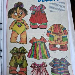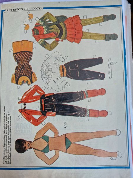 Klippdocka med tillhörande kläder. Föreställer Cici med olika klädesplagg som läderkjol, läderjacka, spetsar, brodyrer, sjömanskostym och korta kjolar.