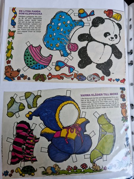 Klippdocka föreställande en panda med tillhörande kläder. Arket innehåller även en klippdocka med varma kläder.
