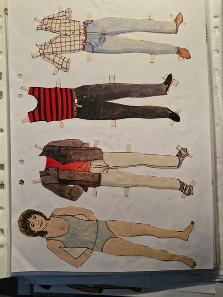 Klippdocka med tre olika kläduppsättningar. En uppsättning består av rutig skjorta, jeans och bruna skor. En annan uppsättning består av en röd- och svartrandig tröja, svarta byxor och svarta skor. Den tredje uppsättningen består av en brun jacka, vita byxor och vita gymnastikskor.