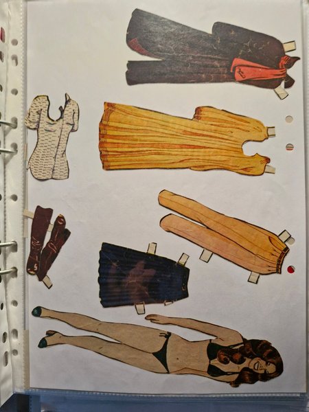 Detta är en klippdocka med tillhörande kläder. Kläderna inkluderar en svart klänning med rött band, en gul klänning, en vit blus, ett par bruna stövlar, en mörkblå kjol och ett par gula byxor. Klippdockan är avbildad i underkläder.