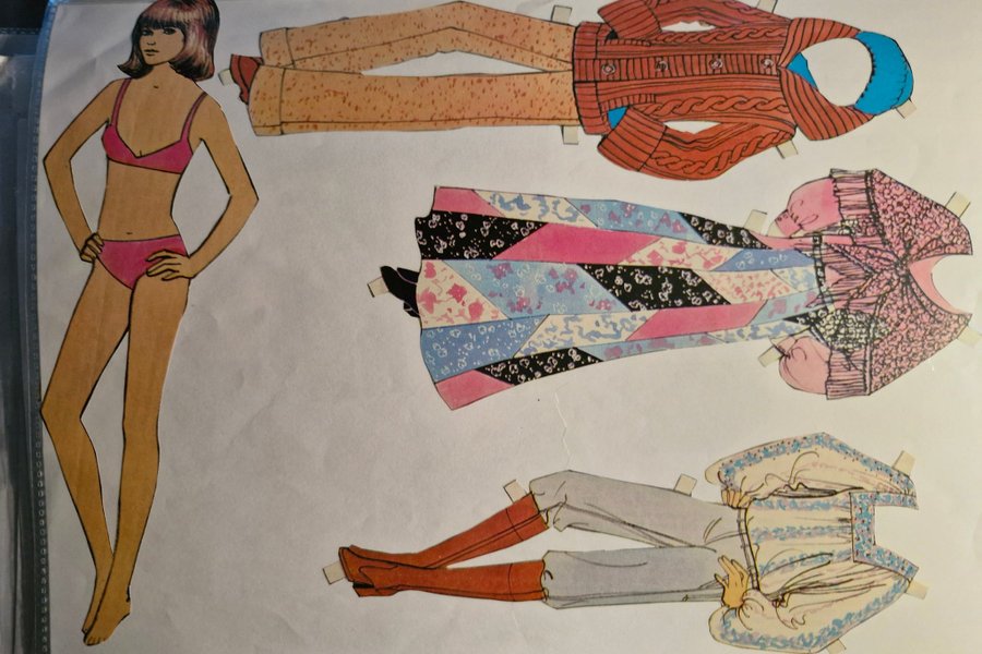 Pappersdocka med tre olika kläduppsättningar. En uppsättning består av en orange tröja och bruna byxor. En annan uppsättning är en lång klänning i rosa, blått, svart och vitt mönster. Den tredje uppsättningen består av en vit blus med blått mönster, grå byxor och orange stövlar.