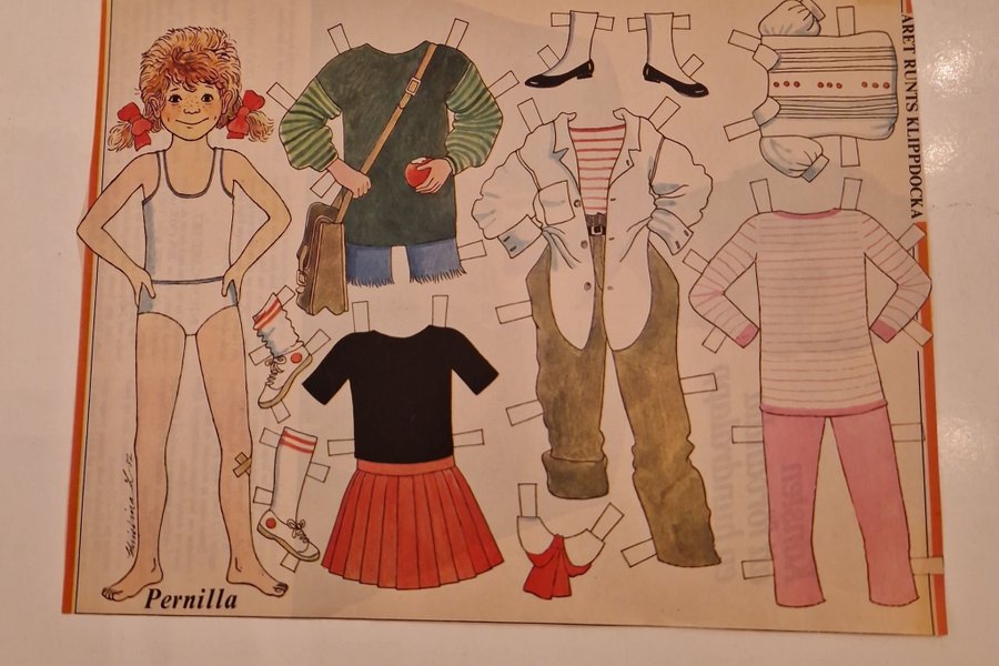 Klassisk klippdocka med tillhörande kläder och accessoarer. Perfekt för samlare eller barn som gillar att pyssla.