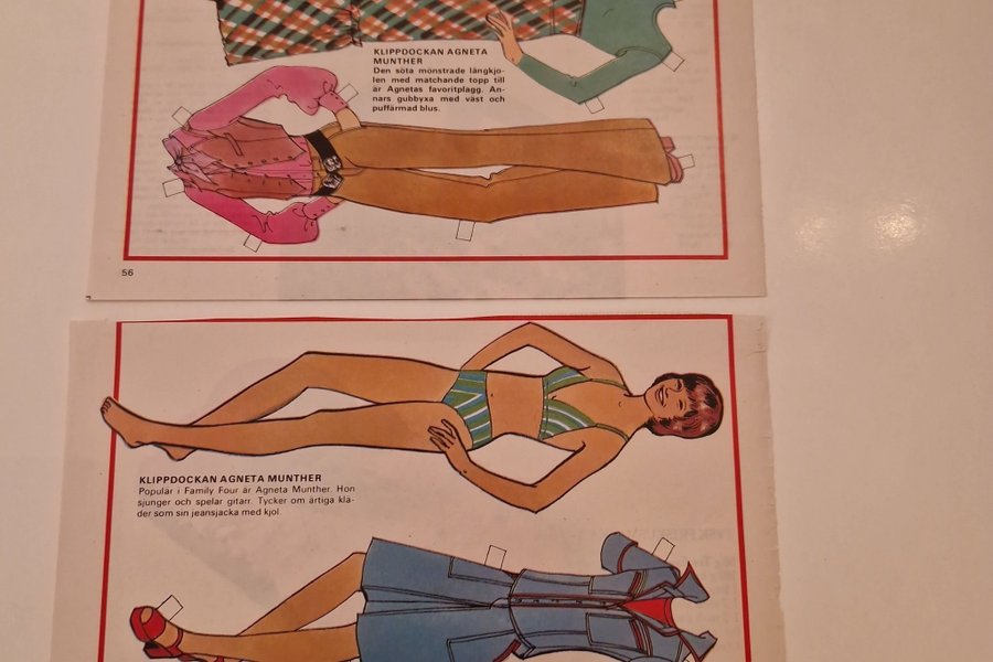 Klippdocka Agneta Munther med tillhörande kläder. Populär från Family Four. Inkluderar långkjol med matchande topp, gubbyxa med väst och puffärmad blus, jeansjacka med kjol och baddräkt.
