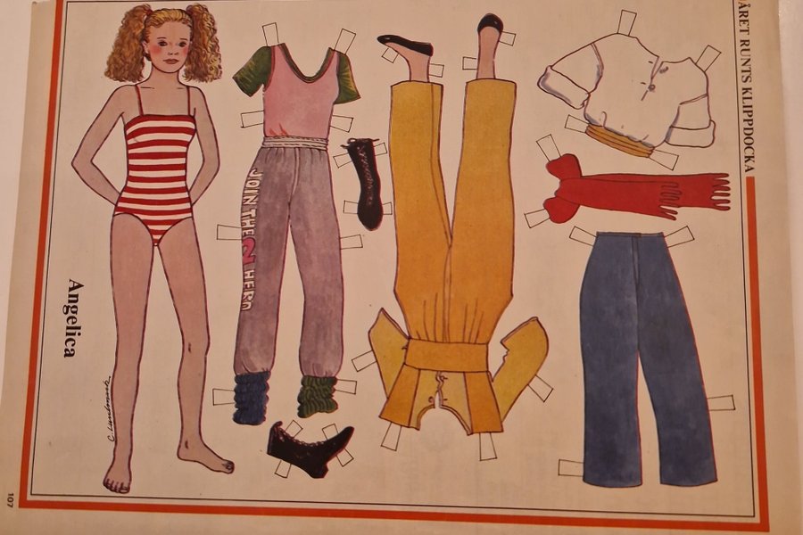 Klassisk klippdocka med tillhörande kläder och accessoarer. Perfekt för den som gillar pyssel och retroleksaker.