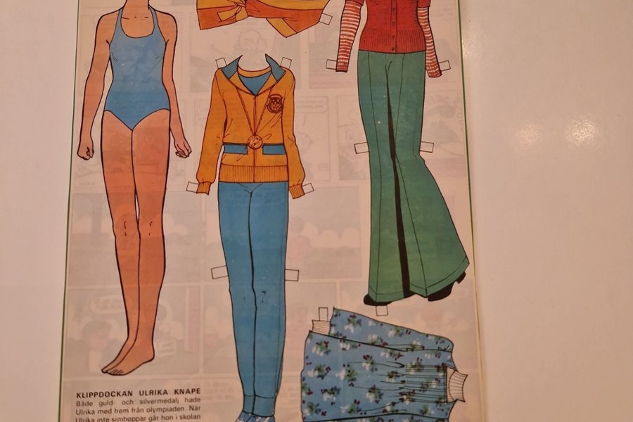 Klippdockan Ulrika Knape med kläder. Ulrika har både guld- och silvermedalj med hem från olympiaden. När Ulrika inte simhoppar går hon i skolan eller kopplar av på diskotek i Göteborg. Här har hon plagg för alla tillfällen!