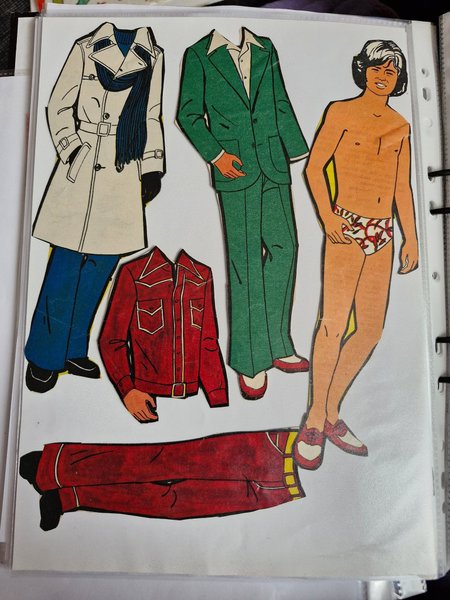 Detta set innehåller en klippdocka föreställande en man och flera olika klädesplagg. Kläderna inkluderar en vit trenchcoat med blå halsduk och blå byxor, en grön kostym med vit skjorta, en röd skjorta och ett par röda byxor. Klippdockan bär även mönstrade badbyxor och röda skor.
