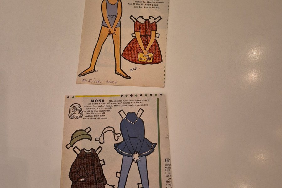 Klippdocka Mona med tillhörande kläder. Mona har en stor garderob med många kläder. Mona tycker om att åka skridskor och har en skridskodräkt samt en finkappa.