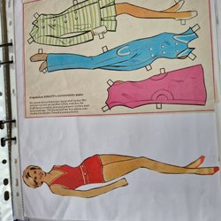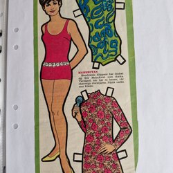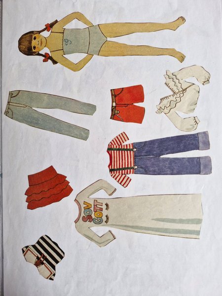 Pappersdocka med tillhörande kläder. Kläderna inkluderar jeans, shorts, en röd kjol, en vit blus med volanger, en randig tröja med hängselbyxor, en lång vit klänning med texten "SOV GOTT" och en svartvitrandig rosett.