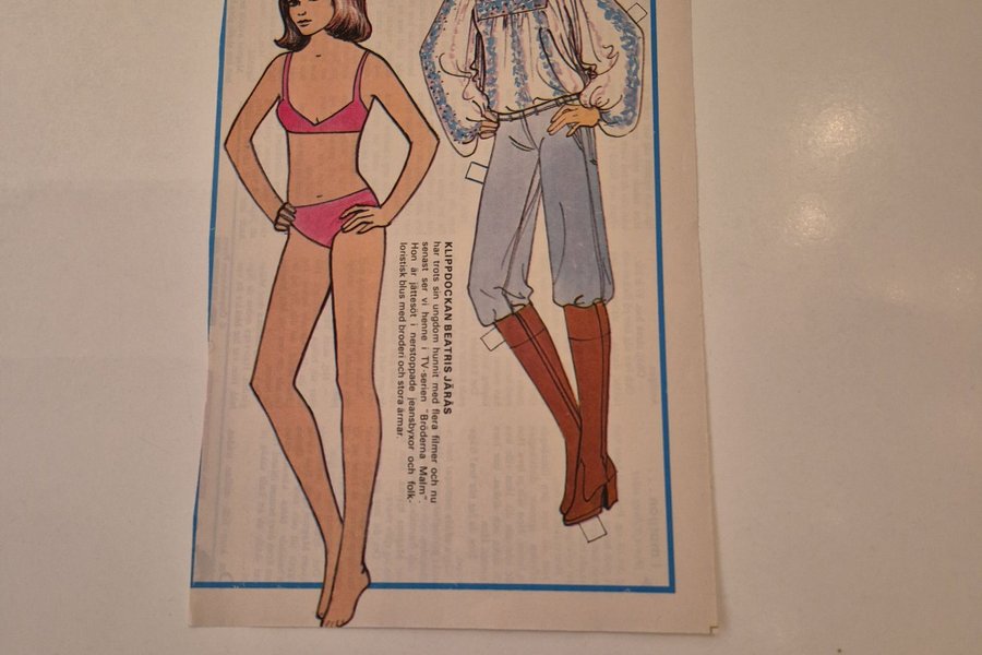 Klippdocka med Beatris Järås i nerstoppade jeansbyxor och folkloristisk blus med broderi och stora ärmar.