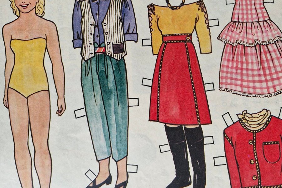 Pappersdocka med tillhörande kläder och accessoarer. Kläderna inkluderar en gul baddräkt, en blå skjorta med väst och byxor, en gul topp med röd kjol och svarta stövlar, en rosa rutig klänning samt en röd jacka med gul halsduk.