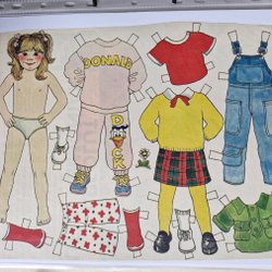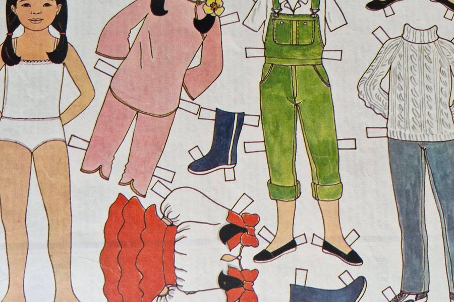 Pappersdocka med tillhörande kläder och skor. Kläderna inkluderar en rosa pyjamas, en grön overall, en vit tröja och blå byxor, samt en röd och vit klänning. Skorna inkluderar svarta ballerinaskor, blå stövlar och sneakers.