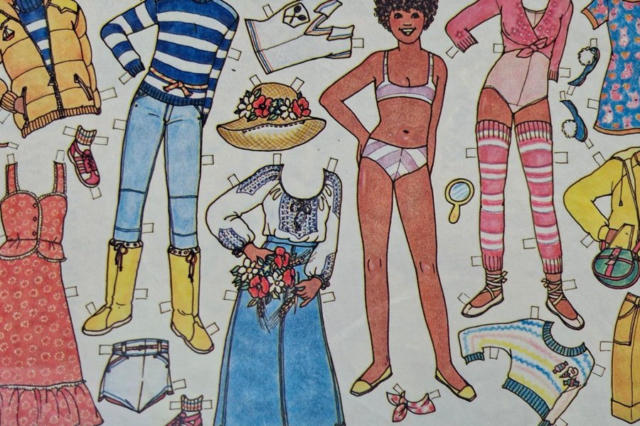 Klippdocka med tillhörande kläder och accessoarer. Kläderna inkluderar en gul vinterjacka, blårandig tröja, jeans, röd klänning, vit blus med blått broderi, blå kjol, rosa topp, rosa underkläder, blå mönstrad klänning, randig tröja, gula stövlar, rosa skor, stråhatt med blommor, vita handskar, rosa strumpor, gula ballerinaskor, handväska, spegel och hårband.