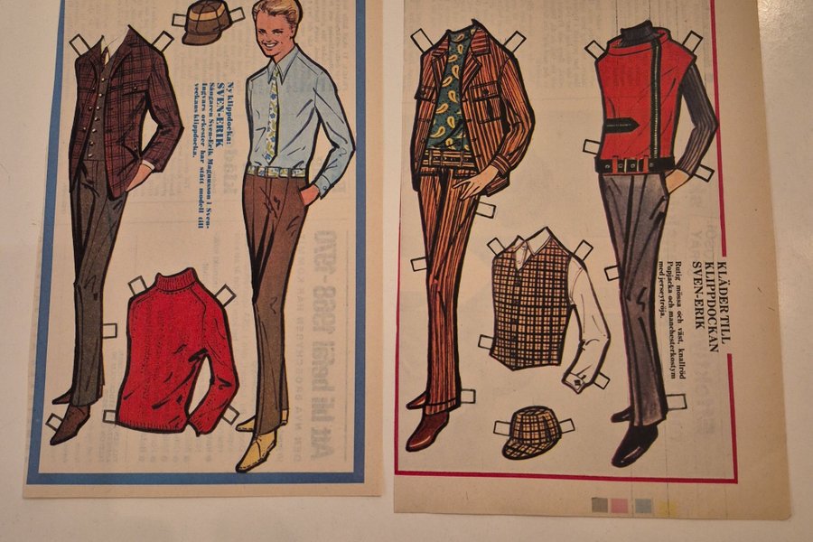 Klippdocka med tillhörande kläder. Kläderna inkluderar rutig mössa och väst, röd popjacka och manchesterkostym med tröja.